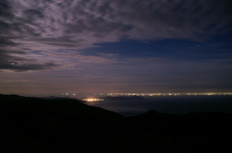 標高500mの「眺瞰台」から見ると、細く伸びた小泊岬(権現崎)の向こうに漁り火が点々と見えていました。権現崎の付け根のひと際明るい灯りは小泊港です。