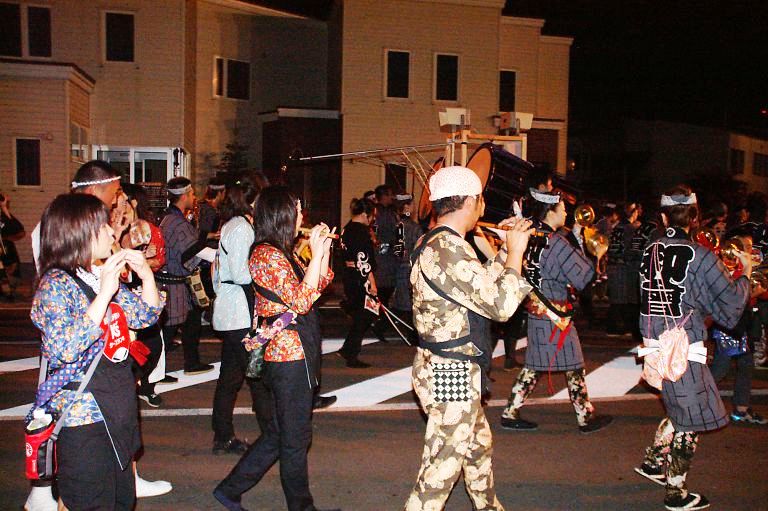 「手振鉦」通称「ジャガネ」と横笛、太鼓を演る囃子方。