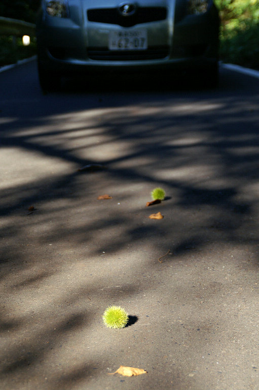 県道のアスファルトの上にイガ栗が落ちていました。秋をアピールするかのように。