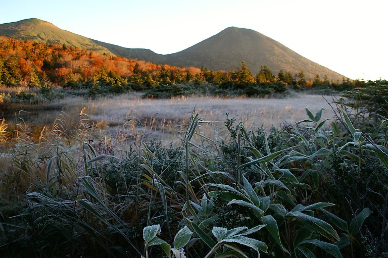 すいれん沼から高田大岳。手前は霜で真っ白。向こうは朝日が当たり始めています。