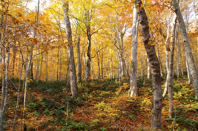 ブナの林床では緑濃いシダ類とハイイヌガヤが目を引きます。