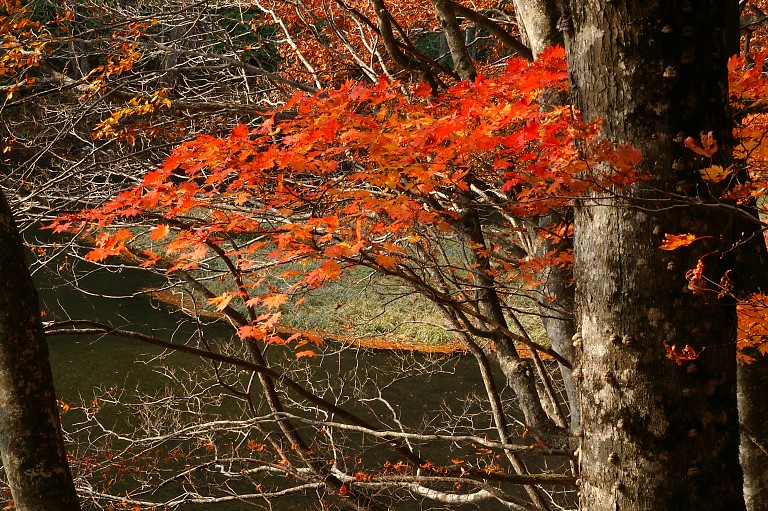 赤いカエデを見つけました。ブナの幹にはツリガネタケが生えています。後方は長沼の奥部で水際に茶色く落ち葉が帯になっています。