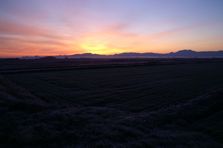 快晴無風の田んぼは一面の霜に覆われていた。野辺地の烏帽子岳の辺りが輝きを増す。右の方の一塊の山は八甲田山。
