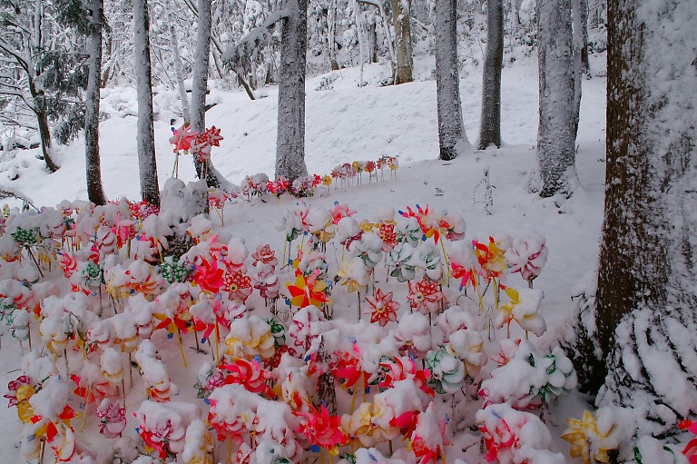 水掛不動尊の後ろに風車が一杯。水子供養。