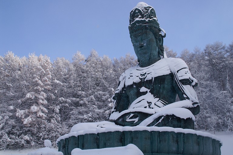背後の樹氷も大仏様に一目置くようだ。