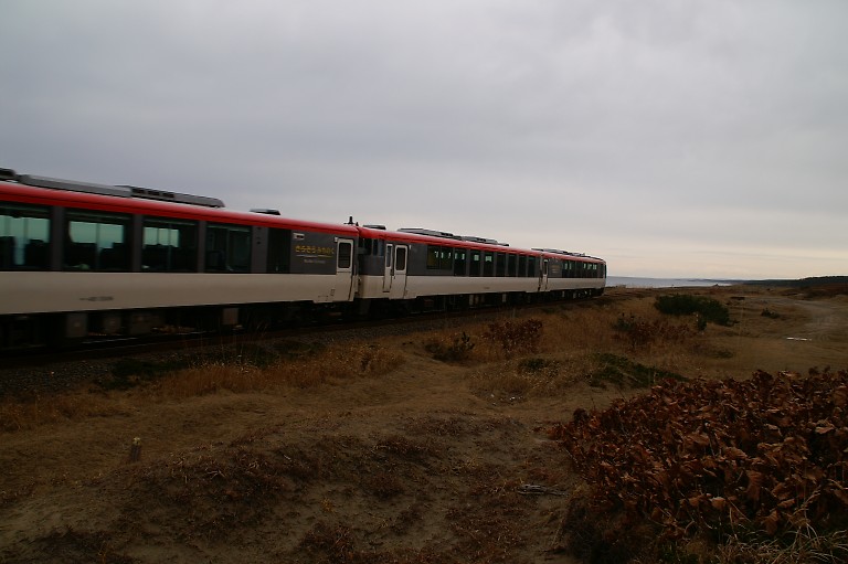11:03に野辺地駅を出た快速「ふるさと下北」が大湊駅方面、陸奥横浜駅に向かって通り過ぎていきます。