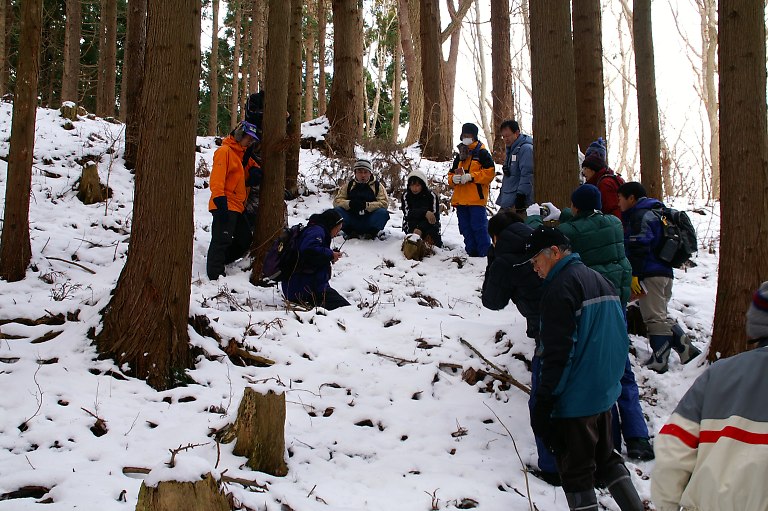 アニマルトラッキング参加者。ウサギの足跡が立ち止まったところをよく観察しています。