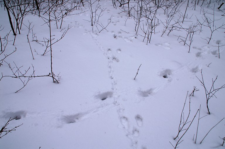 カモシカとウサギとヤマドリの足跡が交錯していました。