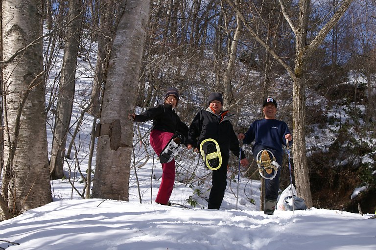 左から、スノーシュー、プラスチックのカンジキ、30年以上前のアルミのカンジキ。