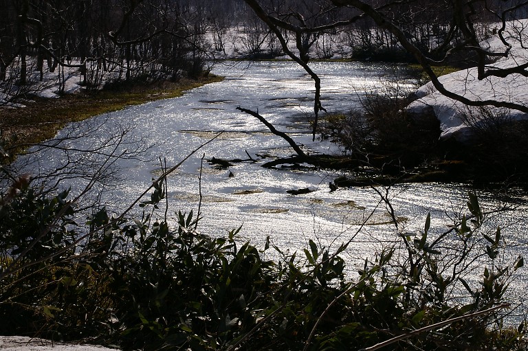 逆行にきらめくグダリ沼。浅いため水草(バイカモ)が顔を出している。