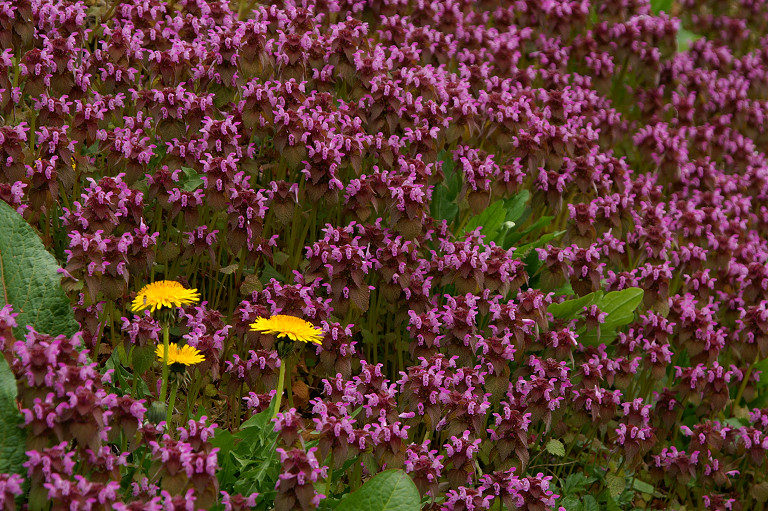 ヒメオドリコソウの群落。タンポポが鮮やかだ。