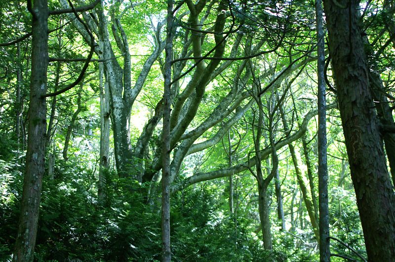 ブナとヒバの混交林。ブナは根元から幹を四方に伸展しているものが多いように見える。