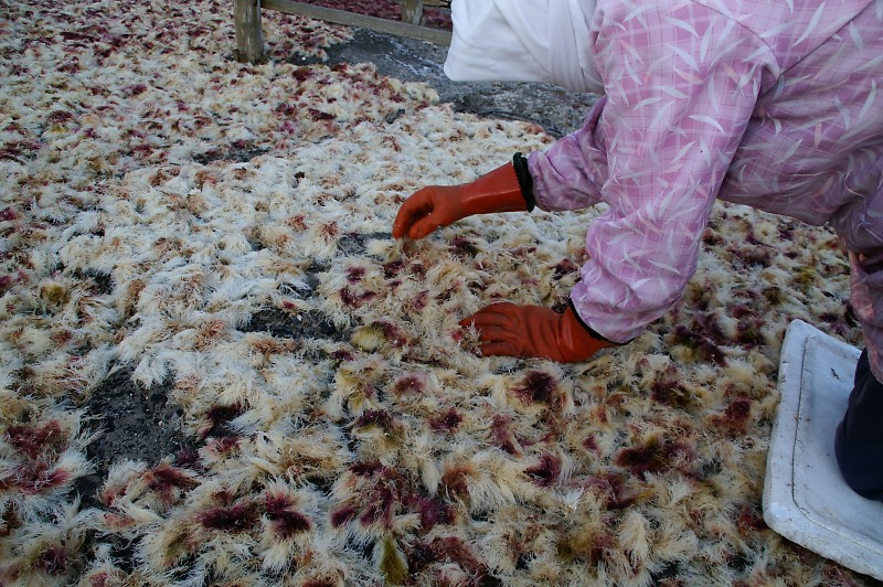 テングサ干し。テングサを一つまみずつ裏返していく、気の遠くなるような作業。陽に当て、水をかけると白くなる。8日間かかるそうだ。