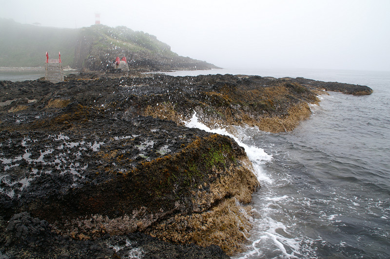 靄に霞む赤白の高野崎灯台。手前の橋は、潮騒橋と渚橋。靄に覆われた海面は不気味だ。