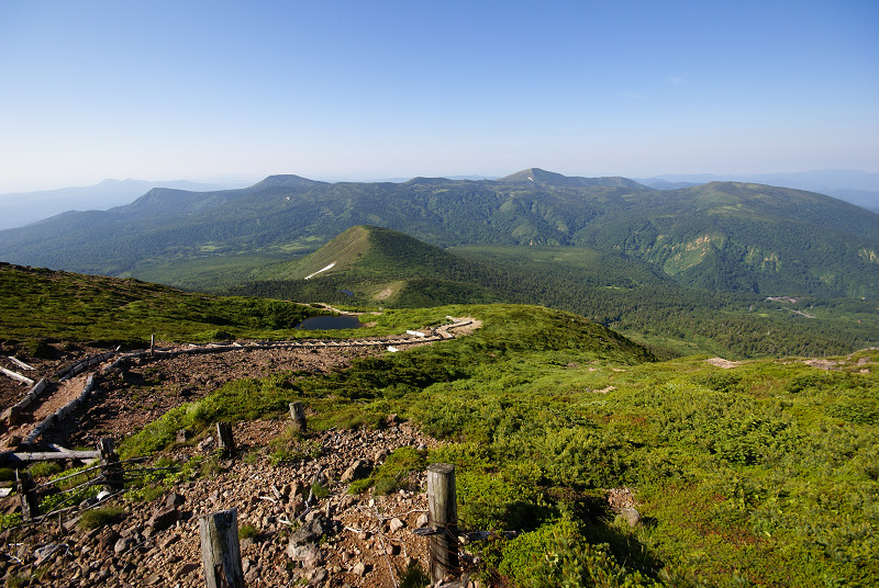 大岳から仙人岱への下り。硫黄岳越しに南八甲田連峰を臨む。手前の池は鏡池。青森県で一番高い両生類の産卵場だそうだ。