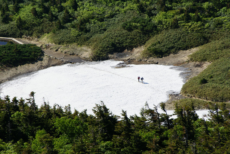 大岳から仙人岱への下り。眼下に残雪を歩くハイカーが見え、声も聞こえる。