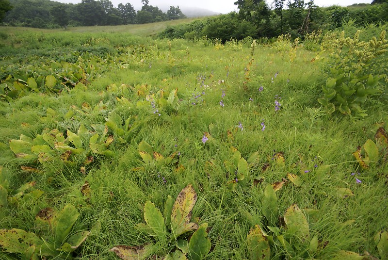 牧場の中の湿地。ミズバショウの大きな葉、タチギボウシの薄紫、コバイケイソウの果穂。