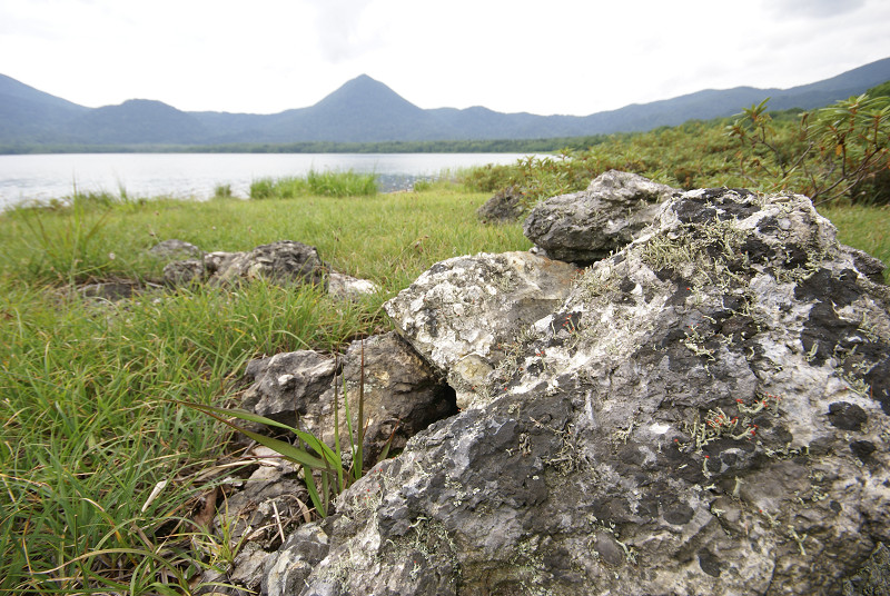 湿地帯に露出した岩にはイオウゴケが付いていた。