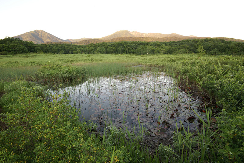 4:36 朝陽が届く直前の湿原は静かだ。北八甲田連峰の頂に陽が当たりはじめたが、ヒツジグサが咲く池はひっそりしている。