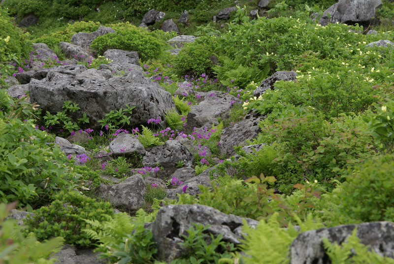ウコンウツギが群生する間のガレが登山道。そのガレ場にミチノクコザクラが根付いていた。