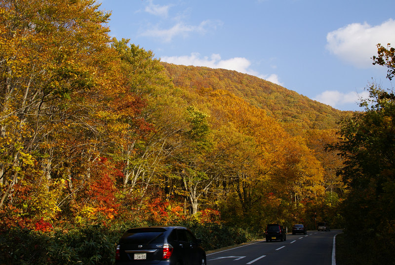 国道103号線では、左右のブナの樹高に阻まれ、大きな山塊の紅葉を見晴らせる区間は少ない。