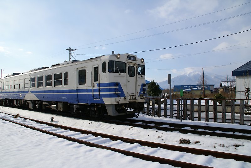 JR五能線深浦行き普通列車キハ40系と岩木山。