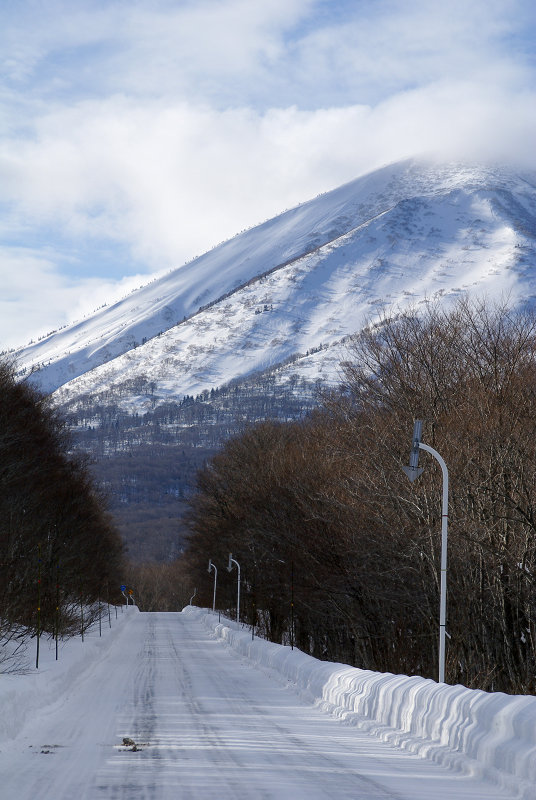 田代平から谷地温泉に向かう国道394号線で高田大岳を見上げた。路端を示す矢印が並ぶ。