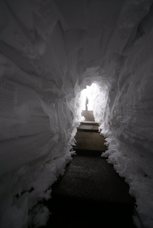 酸ヶ湯温泉の裏口(?)から上の道路への通路は雪のトンネルだった。