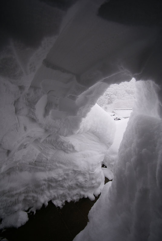 酸ヶ湯温泉の裏口(?)から上の道路への通路は雪のトンネルだった。温泉の建物を振り返った。