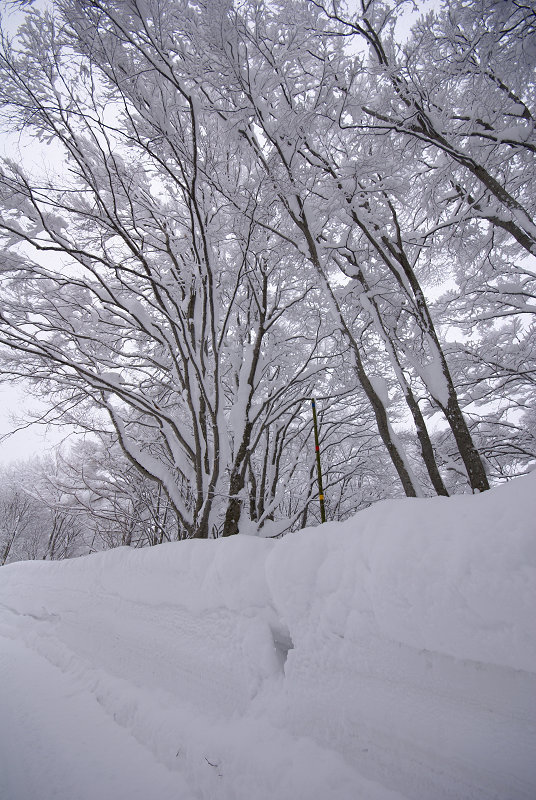 アメダスによると酸ヶ湯の積雪深は280cmを越えている。道路を覆う雪の花咲く樹々。