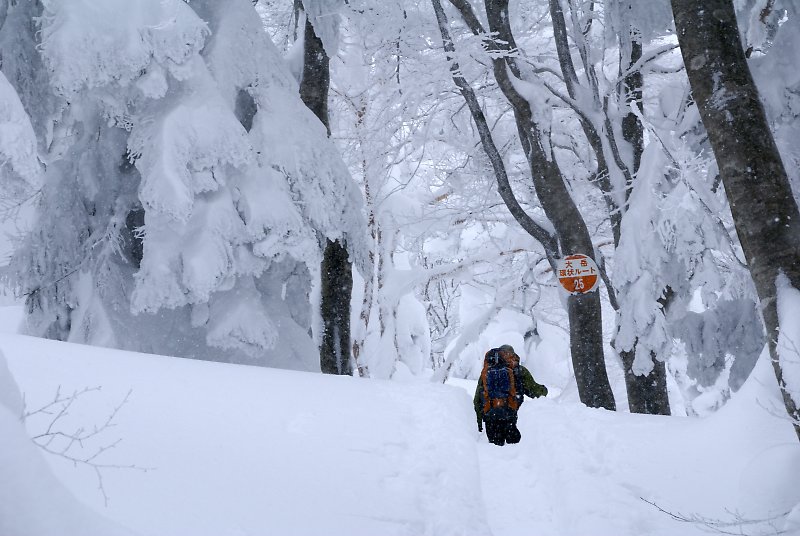 重そうに雪をまとうアオモリトドマツと並ぶブナの幹は裸だ。
