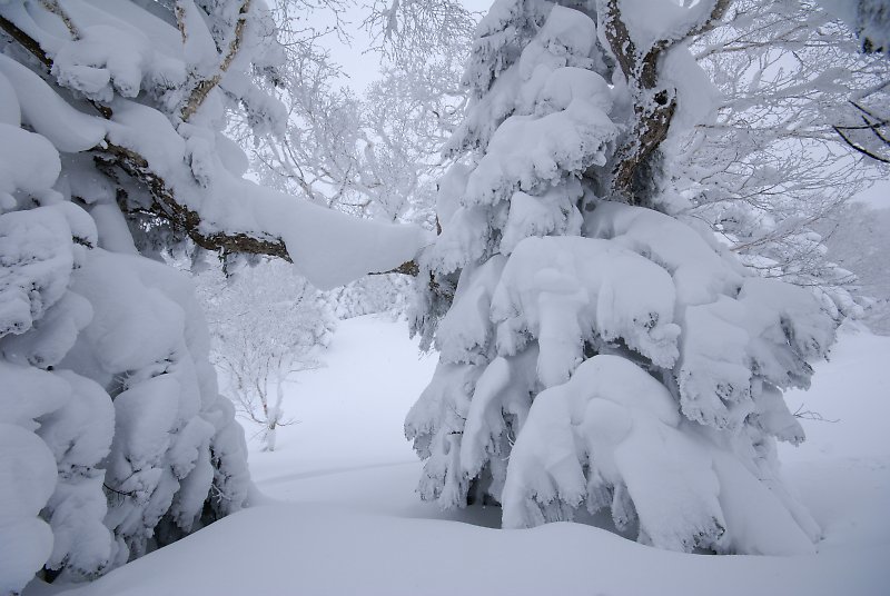 重そうに雪をまとうアオモリトドマツと絡み合うダケカンバ。