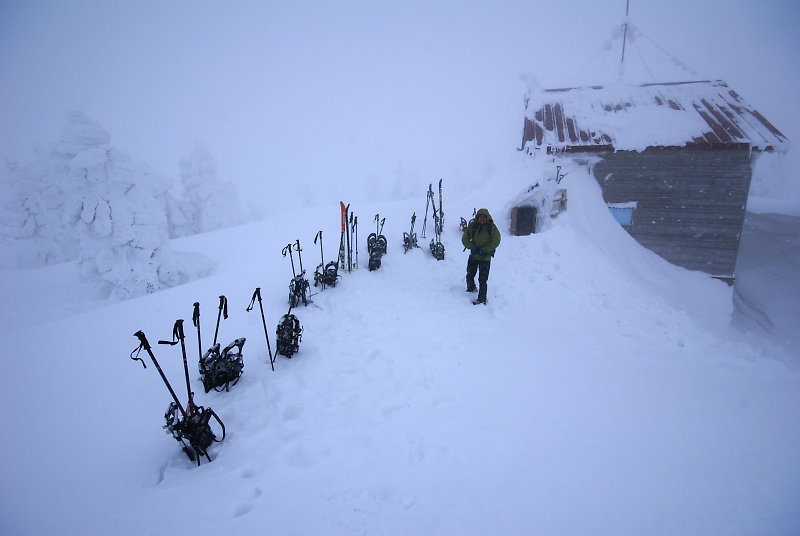 雪に埋まる仙人岱避難小屋。ほとんどの人がスノーシューで登ってきたようだ。