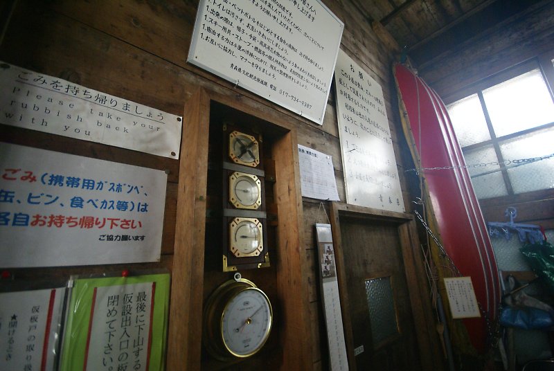 仙人岱避難小屋の内部の壁。気圧計、湿度計、温度計。色々書いてある。