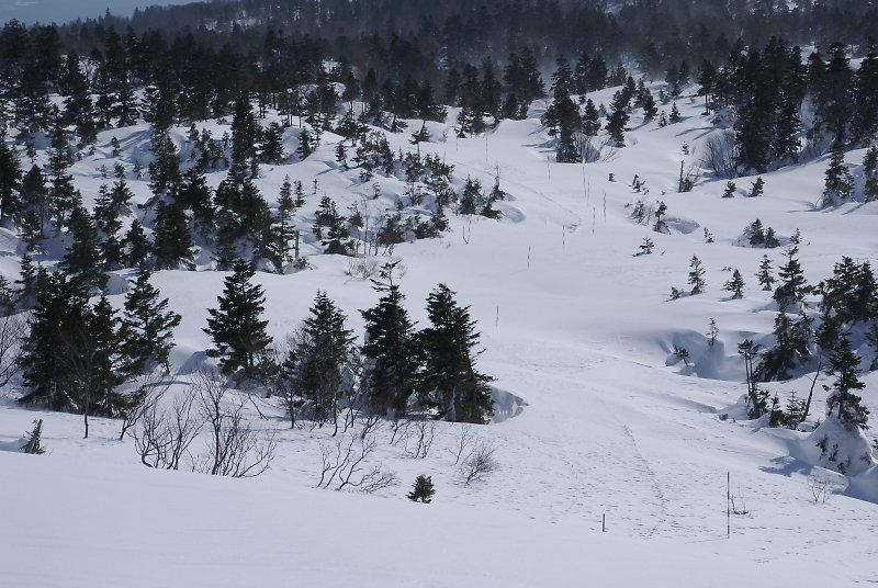 睡蓮沼方面への道を見下ろす。点々と立つポールが道のありかを示している。