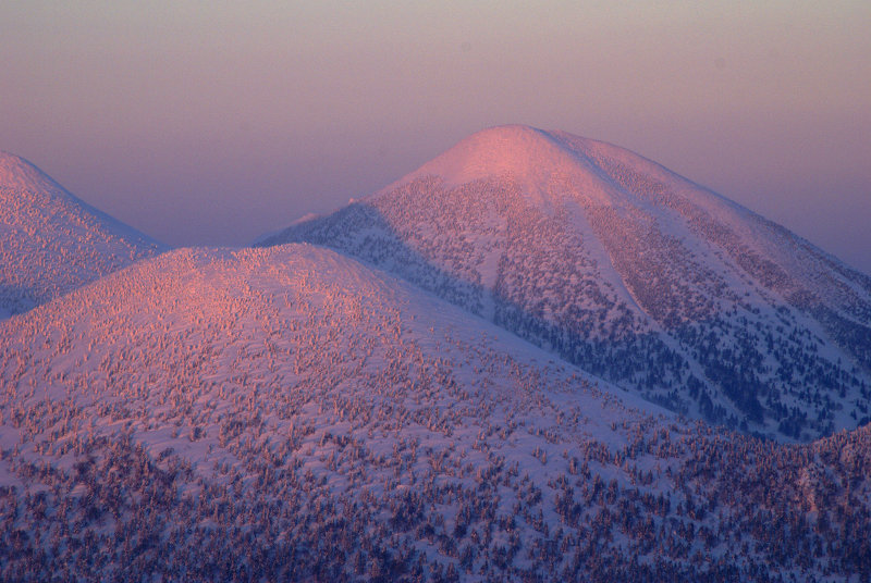 ピンクに染まる硫黄岳、高田大岳。