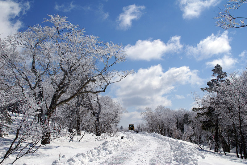 まず、道路線上を湿地ブルで踏み固めていく。ブナの梢には霧氷が付いていてる。