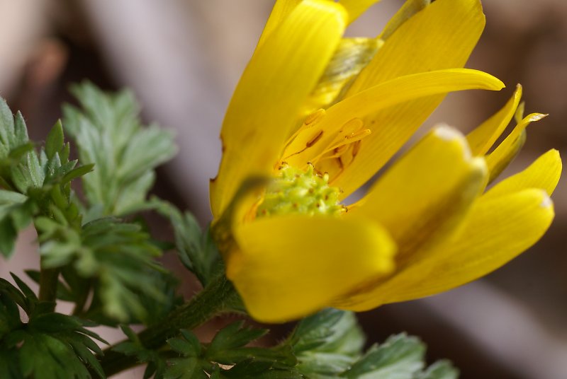 フクジュソウ:福寿草。曇り空のためか、花びらをすぼめたものばかりだった。
