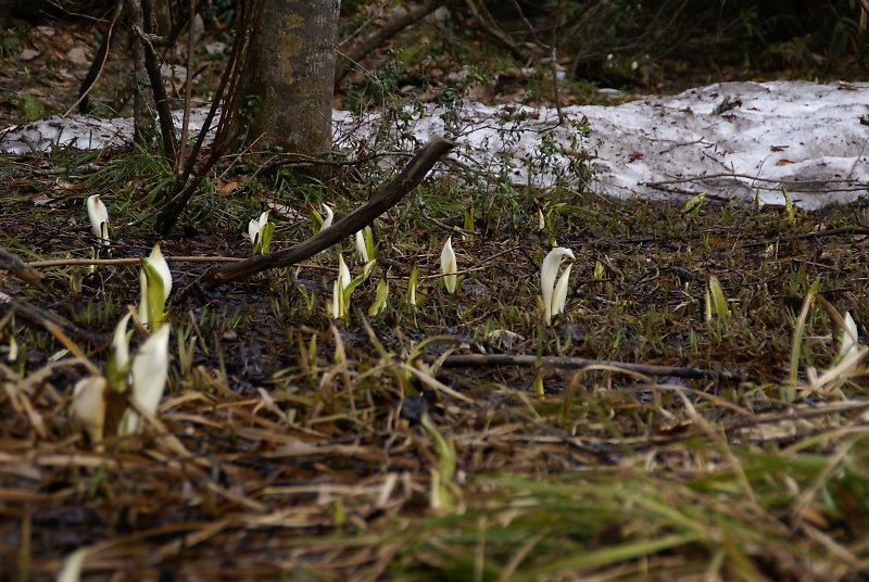 ミズバショウ:水芭蕉。雪が残る湿地でもミズバショウが顔を出していた。やまなみラインにて。