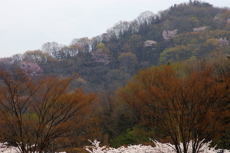 月見野霊園の背後の山を山桜と新緑が彩る。