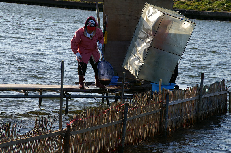 外ヶ浜町蟹田川での「しろうお漁」。四角い網からしろうおを収穫している。