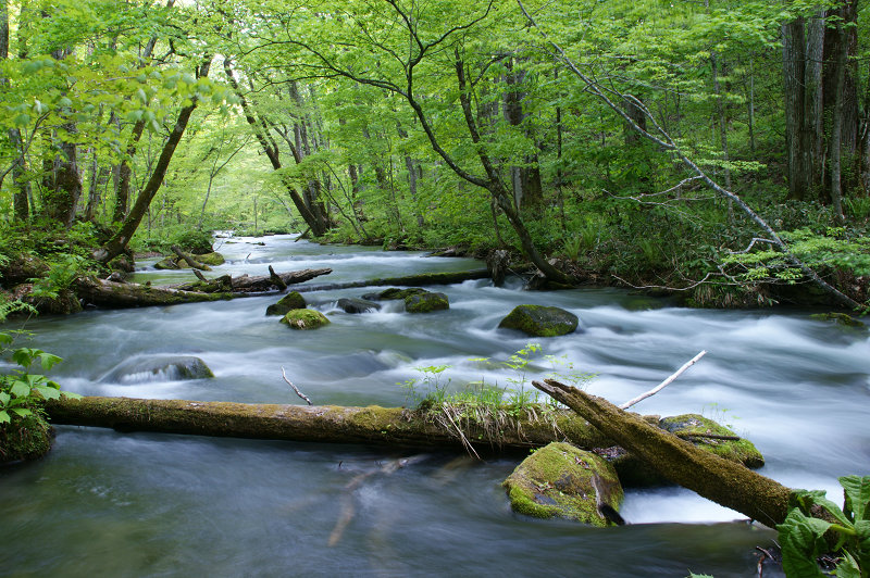 新緑の奥入瀬渓流。倒木が流れに変化を与える。