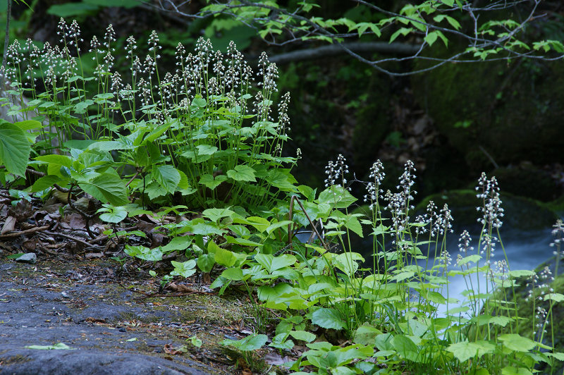 新緑の奥入瀬渓流。無風の渓流でスダヤクシュが群生していた。