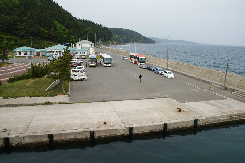 脇野沢港に接岸するむつ湾フェリーの「かもしか」から見下ろす。乗船を待つ観光バス3台と乗用車7台。