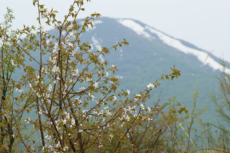 田代牧場からミネザクラ越しに高田大岳を見る。