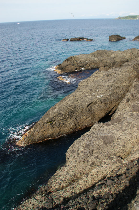 海岸の角礫岩。遠景右は高野崎灯台。