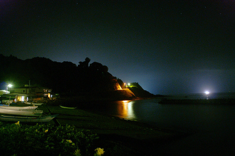 闇に沈む漁業集落。漁り火でシルエットが浮かび上がる。夜空には星も見えている。