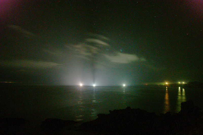 鋳釜崎から東を見る。右の赤みを帯びた光は高野崎灯台。その右の二つの光はキャンプ場の水銀灯。真ん中海上の三つの光は高野崎の近くで操業するイカ釣り船の漁り火。左端微かに見える光は下北半島沿岸の漁り火か?雲の上、星空が広がる。