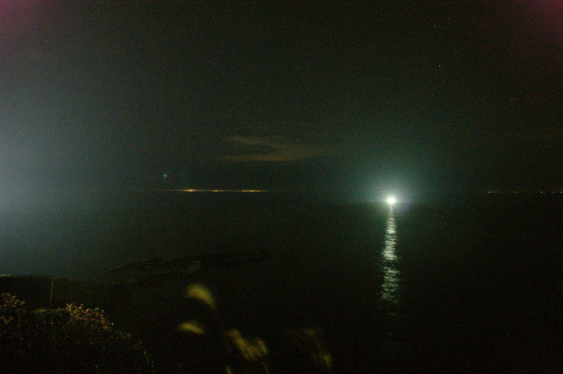高野崎から北東を見る。近くで操業するイカ釣り船の漁り火。水平線の光は下北半島沿岸の漁り火か町の灯か?