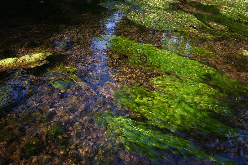 グダリ沼の緑のバイカモ。踏み込むと、湧きツボあたりの水底からは泡が出てくる。